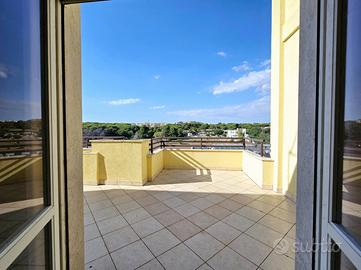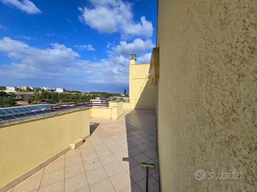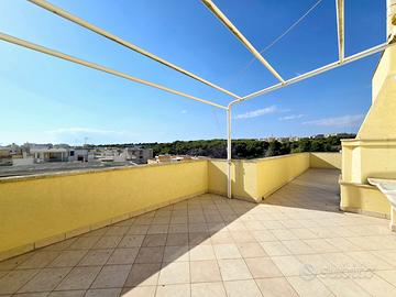 L' immobile: Su un estensione di 65mq, accedendo nell'abitazione troviamo una spaziosa zona giorno con doppia esposizione che la rende molto luminosa; con affaccio tramite porte finestre sul grande terrazzo a livello di 58mq che circonda l'abitazione questo ci permette di ammirare una vista mozzafiato sulla città e sul mare di Gallipoli e inoltre abbastanza spazioso da poter aggiungere un ampio tavolo e goderti cene e pranzi in compagnia. Proseguendo nell'abitazione, incontriamo la cucina con affaccio sempre sul terrazzo, visto l'ampio soggiorno questo spazio può essere utilizzato per la creazione della seconda camera da letto. Attraverso un disimpegno giungiamo alla camera da letto matrimoniale, con porta finestra che affaccia sul terrazzo.