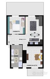 L'ingresso si apre direttamente su una moderna e luminosa zona living con cucina lineare a vista, valorizzata da faretti LED che esaltano l'ambiente e ne sottolineano lo stile contemporaneo. Il vero punto di forza è l'ampio terrazzo, perfetto per pranzi all'aperto, momenti di relax o per accogliere amici e familiari.