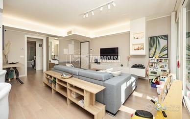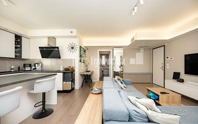 L'abitazione si compone di un luminoso soggiorno con camino ad acqua Fapir, arredi su misura, cucina a vista con isola, due camere da letto di cui una matrimoniale con bagno en suite, secondo bagno finestrato e spazi studiati per garantire comfort e funzionalità.