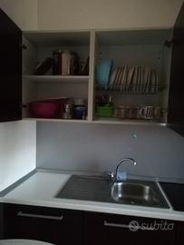 Soggiorno con angolo cottura fornito di piastra ad induzione, forno elettrico, lavastoviglie, pentole, piatti, etc.