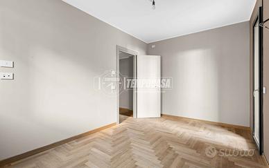 Pavimentazione in parquet a spina di pesce in rovere in tutti gli ambienti principali, per un tocco di eleganza e calore.