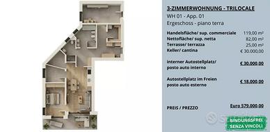 Rf.nr.: M263-3 Questo trilocale ben distribuito, situato al piano terra, offre due camere da letto, un bagno, un wc e una luminosa zona giorno con cucina integrata. L'ampia terrazza crea ulteriore spazio vivibile e invita a piacevoli momenti di relax all'aperto. L'edificio sarà realizzato secondo criteri costruttivi sostenibili ed efficienti dal punto di vista energetico, soddisfacendo gli elevati standard CasaClima A. La consegna chiavi in mano garantisce un'elevata qualità costruttiva e tempi di realizzazione contenuti. Gli appartamenti si distinguono per una distribuzione degli spazi ben studiata, un concetto abitativo moderno e un'atmosfera particolarmente accogliente. Le ampie superfici vetrate assicurano ambienti luminosi e ariosi. Ogni unità dispone inoltre di una terrazza e/o di un balcone. Per il parcheggio sono disponibili posti auto in garage al prezzo di 30.000 € e posti auto esterni a 18.000 €. Alcuni appartamenti sono dotati di una spaziosa cantina, direttamente collegati alle unità abitative, utilizzabili come deposito, hobby room o spazio di lavoro (prezzo a parte - vedi planimetrie). Poiché l'immobile non è convenzionato, si presta perfettamente anche come seconda casa o appartamento per vacanze, offrendo così la massima flessibilità di utilizzo. Consegna: fine 2026 Riscaldamento: riscaldamento centralizzato a pavimento con teleriscaldamento Classe energetica: CasaClima A Tipologia di consegna: chiavi in mano Al fine di tutelare la privacy, precisiamo che gli indirizzi presenti negli annunci sono puramente indicativi. Per visionare l'immobile o ricevere ulteriori informazioni siamo a disposizione! Questo immobile in vendita viene proposto dall'agenzia immobiliare HOME IMMOBILIARE. Siamo specializzati nella compravendita d'immobili in tutto l'Alto Adige, i nostri punti di forza sono soprattutto la trasparenza e la professionalità. Inoltre, accompagniamo ogni cliente dalla proposta d'acquisto fino all'atto notarile. Siamo