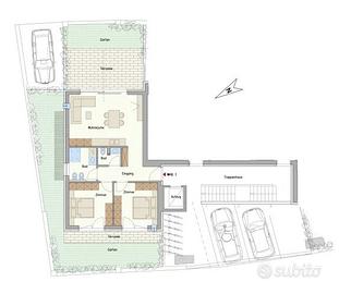 L'appartamento si distingue per una distribuzione degli spazi ben studiata e ambienti luminosi e accoglienti. L'ingresso conduce alla zona giorno open space con soggiorno e cucina, dalla quale si accede direttamente all'ampia terrazza di circa 30 m² e al giardino privato di circa 56 m². Lo spazio esterno è ideale per momenti di relax, convivialità all'aria aperta o per famiglie con bambini. Due camere da letto offrono spazio sufficiente per diverse esigenze abitative, mentre due bagni contribuiscono ad aumentare il comfort abitativo.