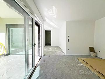 L'appartamento si trova al piano terra di un edificio moderno e colpisce per il luminoso soggiorno con cucina a vista, che si apre armoniosamente sull'ampia area esterna. Le due camere da letto, ben distribuite, garantiscono tranquillità e privacy, mentre i due bagni, curati nei dettagli, offrono ulteriore comfort. Le grandi superfici vetrate assicurano una piacevole luminosità naturale e un'atmosfera accogliente. Il giardino di circa 125 m² e la terrazza di circa 46 m² offrono ampi spazi per rilassarsi, coltivare il verde o trascorrere momenti conviviali all'aperto.