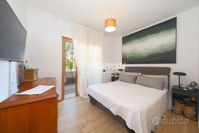 disimpegno, bagno finestrato con doccia, camera da letto con uscita sul balcone, seconda camera con bagno padronale e accesso diretto a un terrazzino.