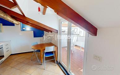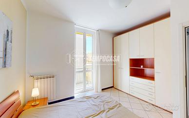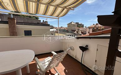 Si tratta di un alloggio, completamente ristrutturato, esposto a sud, così composto: al primo piano, ingresso su disimpegno, bagno finestrato con doccia, ampio soggiorno luminoso con accesso a lungo balcone, prima camera da letto padronale con accesso a medesimo balcone, cameretta spaziosa; al secondo piano, sottotetto attrezzato con cucina (con split aria calda/fredda) e terrazza panorcamica con vista sul castello di Pietra Ligure e sul centro storico.
