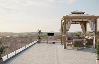 L'abitazione si apre su un luminoso soggiorno con angolo cottura, caratterizzato da un affaccio diretto sulla veranda semicoperta, spazio ideale per momenti di relax e convivialità. Un comodo disimpegno conduce alla zona notte composta da una camera matrimoniale, una camera singola e un bagno finestrato completo di box doccia. Attraverso una scala interna si accede direttamente alla terrazza sovrastante di proprietà esclusiva, situata al piano superiore, completamente rifinita e con una superficie di circa 65 mq.