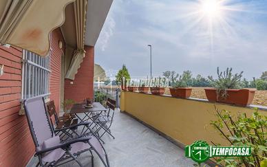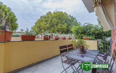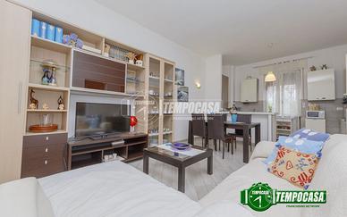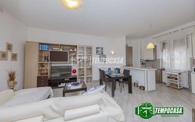 L'ingresso si apre su una luminosa zona giorno con cucina a vista, impreziosita da finiture moderne e raffinate, che si affaccia direttamente sul verde circostante, regalando una piacevole sensazione di apertura e tranquillità. Le ampie finestre permettono alla luce naturale di entrare in ogni ambiente, valorizzando gli spazi e creando un'atmosfera calda e accogliente. La zona notte è composta da due camere da letto ben proporzionate e da un bagno moderno, dotato di sanitari sospesi e una comoda doccia in cristallo.