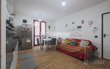 L'ingresso apre su una luminosa zona giorno, valorizzata da una grande porta-finestra che dona aria e luce all'ambiente, con pratico angolo cottura perfettamente organizzato.