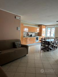 La cucina Febal è dotata di lavastoviglie, forno e cucina a gas Rex, cappa, frigorifero e freezer ad incasso, tavolo e sedie in legno che può ospitare 10 persone, disimpegno con armadio a muro fatto su misura, bagno con lavatrice, vasca e doccia, camera matrimoniale con letto e armadio a due ante scorrevoli e camera singola con due letti a castello e armadietto. Nelle camere è presente il parquet.