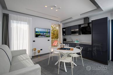 Questo appartamento si compone di ampio soggiorno con divano letto, angolo cottura attrezzato, camera matrimoniale, camera a due letti, due bagni con box doccia, giardino privato con arredi per esterno oppure, se ai piani, con balconi.