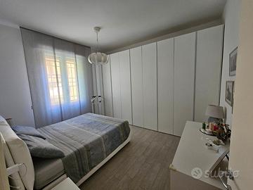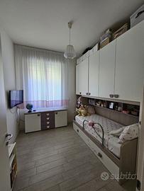 camera matrimoniale, camera singola (con ulteriore letto a scomparsa), ampio soggiorno con cucina e divano letto matrimoniale, un bagno con doccia e termoarredo, un balcone con tenda motorizzata, un piccolo ripostiglio con lavatrice e caldaia a condensazione di nuova generazione.