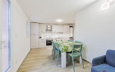 - Zona giorno: soggiorno con angolo cottura che si apre su un ampio terrazzo panoramico con vista sulla pineta.