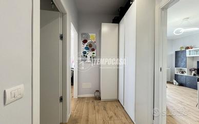 L'ingresso si apre su un ampio e luminoso open space che unisce soggiorno e cucina in un ambiente moderno e accogliente, con accesso diretto a un balcone che amplia lo spazio abitativo. Attraverso un disimpegno si accede alla zona notte, dove troviamo una camera matrimoniale dal design essenziale e luminoso e arricchita da una cabina armadio fatta su misura, un bagno finestrato di generose dimensioni con una spaziosa doccia e una cameretta con balconcino privato, perfetta anche come studio o stanza per i più piccoli.