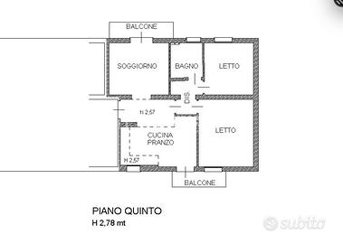 -INTERNO: Appartamento posto al 5 e ultimo piano con ascensore, composto da: Ingresso con cucina e balcone, soggiorno con ulteriore balcone, due camere da letto, un bagno e un ripostiglio.