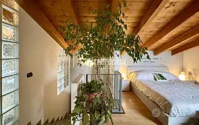 Piano secondo: Ampia zona notte finemente rifinita con parquet in tutti gli ambienti e travi a vista, cabina armadio, bagno privato e terrazzo a tasca riservato.