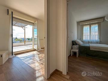 Zona giorno open space con cucina e soggiorno, in affaccio diretto sulla terrazza panoramica: lo spazio perfetto per rilassarsi e vivere momenti di convivialità con amici e parenti.