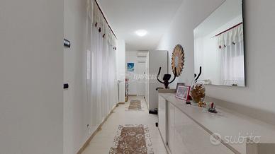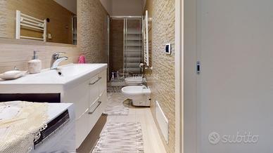 La soluzione si presenta elegante e in ottimo stato ed è caratterizzata da porta d'ingresso blindata, infissi in PVC con vetrocamera, pavimentazione in grès porcellanato effetto parquet chiaro, bagno rivestito in grès effetto pietra, luci di emergenza, impianto di condizionamento, videocitofono, riscaldamento autonomo a radiatori e porte interne in legno sia a battente che a scrigno.