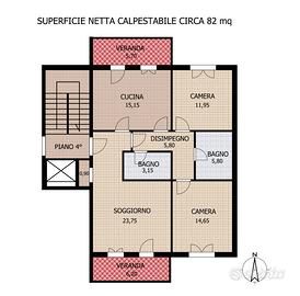 Nonostante si tratti di un trivano, l'appartamento offre oltre 80 mq netti interni, a cui si aggiungono due verande. Gli ambienti sono ben distribuiti e comprendono due bagni (ciechi), camere da letto ampie (di 12 mq e 14,6 mq) e una cucina abitabile particolarmente versatile, dotata di due porte e due finestre, facilmente divisibile in cucinotto e studio.
