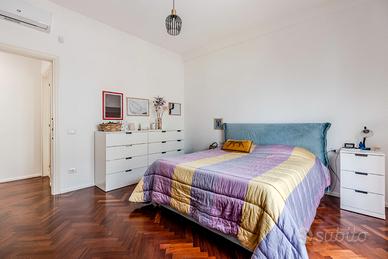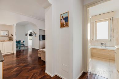 L'immobile, di circa 82 mq netti, offre ambienti comodi e ben distribuiti: ampia zona giorno con cucina riservata, spazio pranzo adatto a ospitare anche otto persone, valorizzato da un elegante mosaico realizzato con antiche cementine restaurate inserito nel parquet, e zona living con accesso diretto alla terrazzina a livello di circa 20 mq, dove è presente una comoda zona lavanderia.