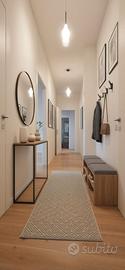 Ci accoglie un ingresso con disimpegno che collega alla zona giorno dove troviamo un grande salone panoramico con vista che va dai giardini pubblici fino al Monte Altari. Dall'altro lato troviamo una cucina abitabile con balcone che affaccia sulla corte interna.