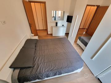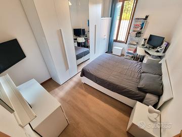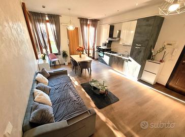 L'appartamento è composto da una zona giorno Open-Space con cucina a vista e accesso al giardino privato di circa 40 mq, esposto a Sud e provvisto di una zona piastrellata e attrezzata per il barbecue. Il disimpegno ci accompagna alle due camere da letto ed al bagno, dotato di box doccia.