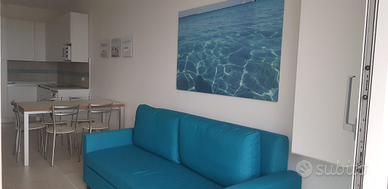 Bicamere in residence frontemare con piscina e spiaggia privata con comodo terrazzo attrezzato per mangiare fuori.
