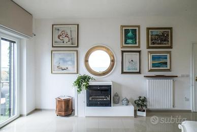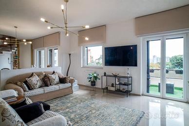 Quarto piano: - Zona giorno: Ingresso su ampio doppio soggiorno con camino a bioetanolo, rivestimenti di pregio e grande luminosità grazie alle aperture panoramiche. L'ambiente presenta una zona living e una zona pranzo ben definite, arricchite da dettagli architettonici accurati. La cucina abitabile, realizzata artigianalmente su misura, è dotata di penisola in noce massello e piano di lavoro in marmo africano; elettrodomestici incassati, disposizione razionale degli spazi, accesso diretto a uno dei tre balconi verandato.