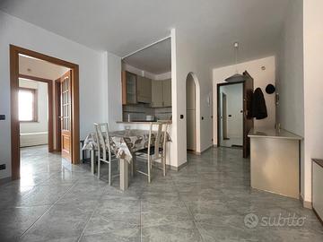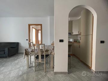 L'appartamento si apre su un accogliente soggiorno con angolo cottura, prosegue con due camere da letto e un bagno completo di vasca idromassaggio.