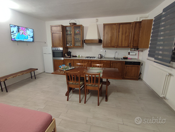 Appartamento bilocale al piano terra di 58 mq arredato con garage e cortile, composto da ingresso in cucina abitabile attrezzata con cucina Scavolini e lavastoviglie, bagno con box doccia e lavatrice, camera da letto con accesso a piccolo cortile posteriore.