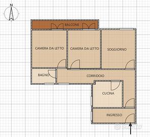 È composto da ingresso, cucina con dispensa, tre camere, di cui due con accesso diretto al balcone, e un bagno.