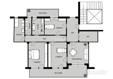 L'ingresso si apre su un disimpegno che conduce a quattro camere, una cucina e i due bagni offrono praticità e comfort; l'appartamento è dotato di riscaldamento termo autonomo e aria condizionata.