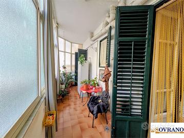 L'immobile si presenta in buono stato e con una distribuzione degli spazi funzionale e ben articolata: l'ingresso conduce ad un ampio disimpegno, dal quale si accede al salone comunicante con il soggiorno affacciato sul balcone a prospetto. La zona notte comprende una camera da letto matrimoniale finestrata e due camerette, anch'esse con balcone a prospetto comunicante con il soggiorno. Completano la proprietà due bagni finestrati con vasca, un ripostiglio e una cucina semi-abitabile, valorizzata dalla presenza di una grande veranda adiacente.