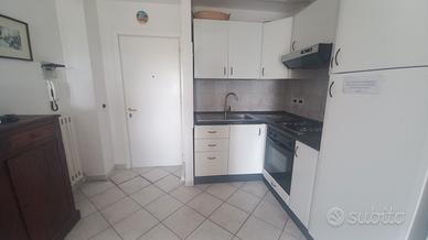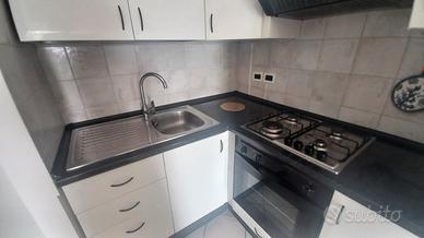 Soggiorno con angolo cottura e accesso al balcone, camera matrimoniale, camera singola e due bagni.