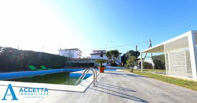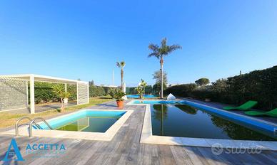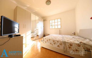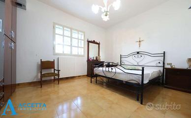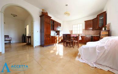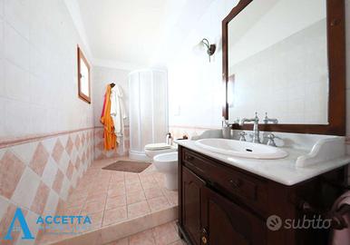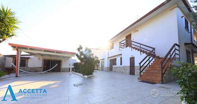 (Riferimento: 470) Proponiamo in vendita, in località Gandoli - Leporano, esclusiva e prestigiosa villa composta da due appartamenti, una dependance e dotata di doppia piscina. Sviluppata su un lotto di circa 1.400 mq., al piano terra troviamo un appartamento composto da un soggiorno, un'ampia cucina-pranzo, 4 camere da letto, 2 bagni e 2 porticati; al primo e secondo piano è presente il secondo appartamento, interamente ristrutturato e composto da un triplo salone con camino, una cucina abitabile con struttura in muratura, 3 camere da letto, 2 bagni e un terrazzino; esternamente invece troviamo l'incantevole ed ampio giardino, con ben 2 piscine ( una grande ed una piccola per bimbi) attrezzate con zona solarium e gazebo, una dependance uso deposito con bagno, barbecue e forno a legna in muratura, piccolo campo da basket, il tutto circondato da prato con irrigazione e piante ornamentali. Situato in riservata zona residenziale tra Talsano e Gandoli, l'immobile è caratterizzato da ampi spazi sia interni, che esterni, dotato inoltre di impianto di riscaldamento autonomo, climatizzatori e cancello automatico. Soluzione ottimale per due famiglie ed ottima come investimento per struttura ricettiva o b&b.