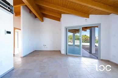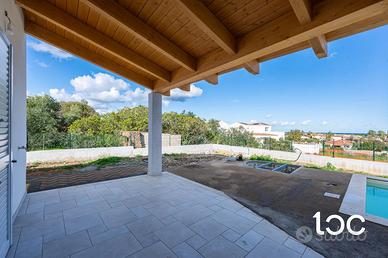 Disposta interamente su un unico livello, la villa gode di grande luminosità naturale, grazie anche ai velux nei bagni che donano luce zenitale e ariosità agli ambienti interni. Una veranda coperta con vista mare introduce alla zona giorno composta da soggiorno spazioso e cucina separata, mentre la zona notte accoglie tre camere da letto e due bagnifinemente rifiniti.