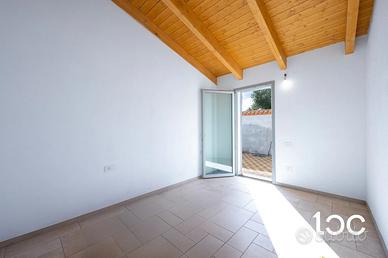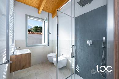 Le finiture interne sono state selezionate con particolare attenzione al design e alla qualità: pavimenti e rivestimenti firmati Marazzi e Ragno, porte del gruppo Garofoli, soglie in granito sardo lavorato. I bagni sono impreziositi da sanitari sospesi, rubinetteria di marca e dettagli eleganti che valorizzano ogni spazio.