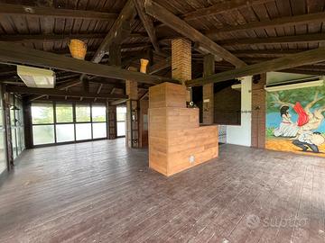 Piano terra con sala ristorante, ricavata da un ampliamento realizzato con tensostruttura, bancone bar, forno a legna, cucina, bagni e locale accessorio per il personale.