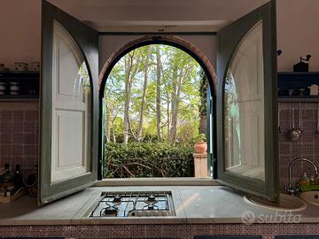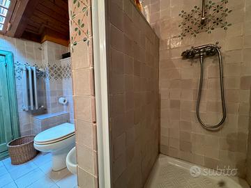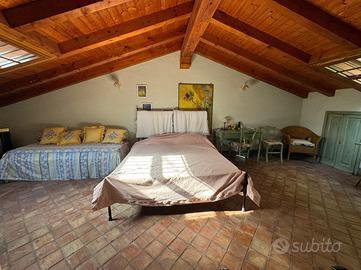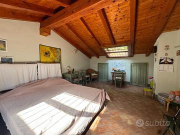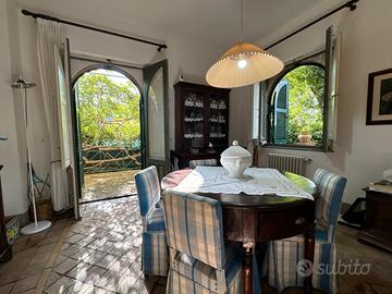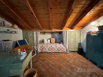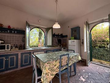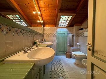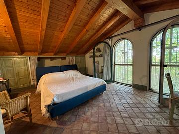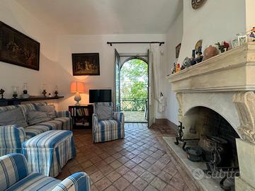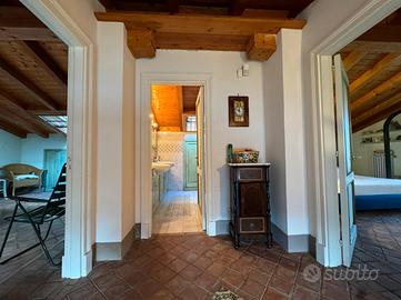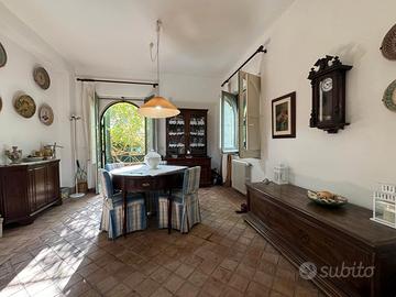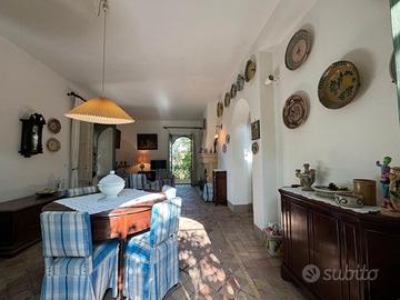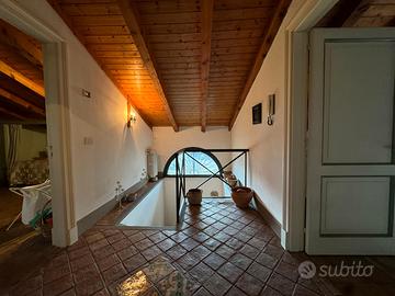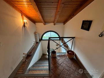 L'abitazione si sviluppa su due livelli, per una superficie complessiva di circa 200 mq. Al piano terra si accede direttamente in una spaziosa zona living, resa particolarmente accogliente da un bel camino e da grandi finestre che riempiono l'ambiente di luce naturale. A impreziosire ulteriormente gli interni è il pavimento in cotto, che conferisce calore e raffinatezza agli spazi, perfettamente in linea con lo stile della casa. La cucina in muratura, ampia e luminosa, affaccia sul verde del giardino ed è arricchita da una pratica dispensa. Completano il piano una camera da letto e un bagno.