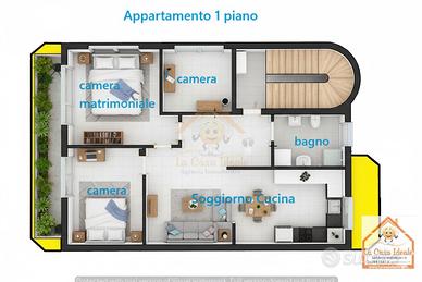 Ingresso, Soggiorno e Cucina con camino, Camera matrimoniale, 2 Camerette e bagno.