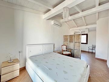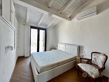 Primo piano: ampia camera da letto con possibilità di creare una cabina armadio, bagno con doccia e veranda vista mare.