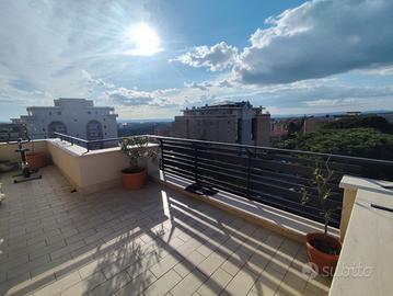 Viterbo: Attico di 135 mq con terrazza abitabile. Affaccio a 180 gradi. Posizione centrale e panoramica. L'appartamento si presenta in ottimo stato di manutenzione. L'unità immobiliare è stata interessata dal SuperBonus 110%. All'ingresso si è accolti da una grande zona giorno molto luminosa, servita da porte finestre che permettono l'accesso alla terrazza. La cucina è abitabile, divisa tra zona fuochi e pranzo. Camino. Tre camere di cui due matrimoniali. Due bagni. Completano la proprietà il garage di 18 mq e il posto auto esterno. Termo-autonomo. - CLASSE ENERGETICA: A4 Rif. 12/02