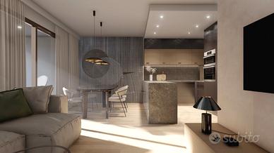 -Zona living open-space con angolo cottura a vista, perfetta per momenti di relax e convivialità, che si apre su una veranda spaziosa di 14 mq
