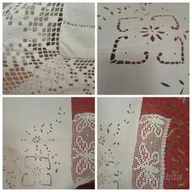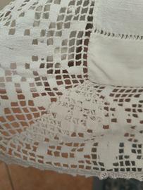 RIPETO: NO MACCHIE, NO BUCHI! BELLISSIMO.La stoffa è il cotone con spessore medio , tela detta " in rotoballe" tessuta a mano. I ricami preziosi e molto ricchi sono ai lati dei 2 cuscini. Uncinetto finale alto cm 10, dopo orlo e orlo a giorno!! Spettacolare!