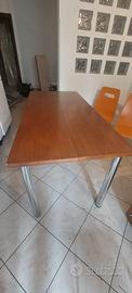 Il tavolo ha il piano in legno color ciliegio e le gambe color acciaio lucido.