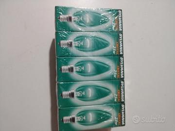 Vendo lotto da 10 lampadine a incandescenza marca Sylvania, modello "Cristal". Le lampadine sono nuove, mai usate, ancora nella loro confezione originale sigillata.