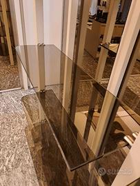 - 5 mensole in vetro traslucido fumè con supporti in acciaio da fissare a muro (oppure a colonnine in ferro color avorio che diamo gratis). Ogni mensola ha un angolo arrotondato e gli altri leggermente stondati (vedere foto). Misure: lunghezza 86 cm, profondità 27, 5 cm.