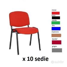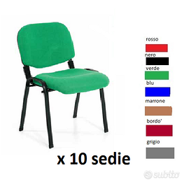 Sono NUOVE e tutto il Prodotto e ARTIGIANATO ITALIANO Le sedie le Produciamo NOI Giornalmente nel Nostro laboratoriofabio3420269434 ( i prezzi sono gia' iva incluse ) 10 Sedie compreso di spedizione tutto a euro 357,00 in TESSUTO di qualsiasi colore di colore NERO - BLU - ROSSO - GRIGIO - VERDE - MARRONE - BORDO' -ARANCIONE 10 Sedie in ECOPELLE di colore ( NERO BLU - ROSSO - GRIGIO - VERDE - MARRONE - BORDO'- ARANCIONE - ARANCIONE ) compreso di spedizione tutto a euro 397,00 VARIANTI : con TESSUTO IGNIFUGO Classe 1 CERTIFICATO e OMOLOGATO dal MINISTERO DELL'INTERNO ( Polipropilene + Master Autoestinguente ) Controllate le spese di spedizioni PER LA CALABRIA - SICILIA - SARDEGNA e ISOLE VA AGGIUNTO UN PICCOLO SUPPLEMENTO CHE VA' CALCOLATO A PARTE ( costo Peso - Traghetto) SCHEDA TECNICA : Struttura ovale in metallo con tubolare da 18mm , Seduta rinforzata da 2 tubi in metallo , Verniciato a forno con polveri epossidiche di colore Nero La seduta e lo schienale hanno un anima di robusto polipropilene Sottoseduta in Tnt di rifinutura Imbottitura da 30 mm M/30 di poliuretano espanso Tessuto in 100% PP di gr 380 lavabili a 40 gradi Piedini in gomma antiscivolo Misure di 1 sedia 54 x 56 x h 80 peso Kg 7,00 Impilabili Accessoriabili con Braccioli, snodo e tavoletta scrittoio, portariviste e gancio di unione Le Sedie arrivano gia ASSEMBLATE e MONTATE Laboratorio Artigianale Industriale IL SARTO SERVICES di TOLLO - Abruzzo per Contract-Alberghi–Hotel-Ristoranti e Privatifabio3420269434