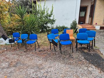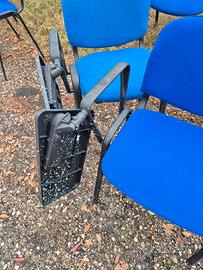 10 Sedie da conferenza o visitatore imbottita in tessuto blu con braccioli e ribaltina scrittoio, struttura in metallo nero.Ufficio, formazione, studio..