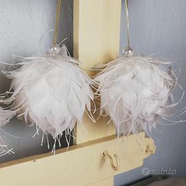 12 palline di Natale, di polistirolo ricoperte di piume bianche e argentate.
